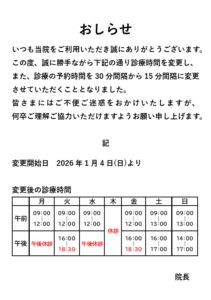 改めまして、診療時間変更のおしらせです。ご迷惑をおかけいたしますが、どうぞよろしくお願いいたします。 -